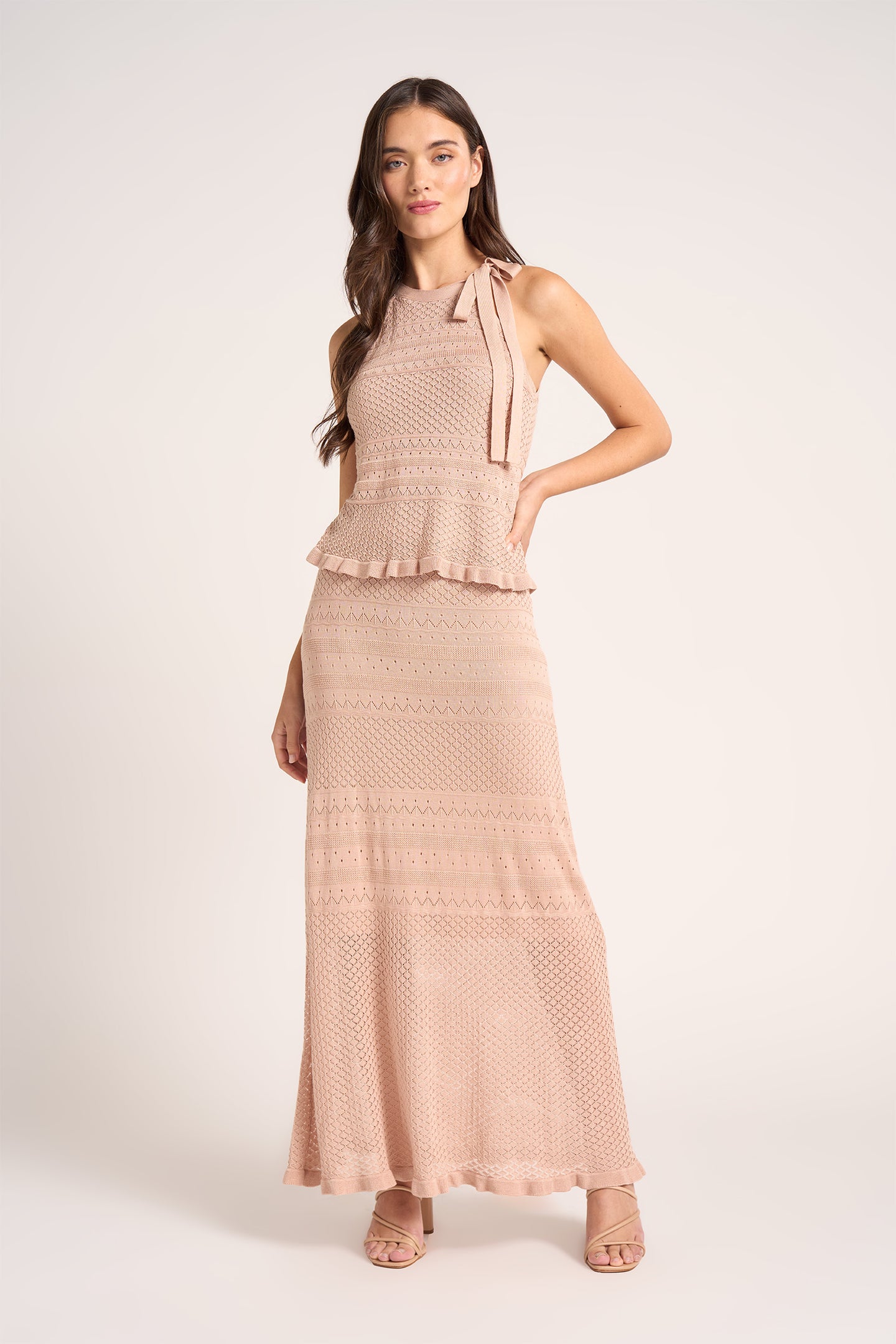 Romantic, charming, and effortlessly cool, the Mae Pointelle Sweater Top captures that Nu Boheme spirit with a self-tie high neckline and airy pointelle texture that feels as good as it looks. Crafted from 100% LENZING™ Viscose, it’s soft, breathable, and naturally drapes with a flattering fit that moves with you. Wear it with the matching Belle skirt for a full set moment, or layer it under a blazer for a polished edge. From office hours to dinner dates, this is the top you'll reach for again and again.